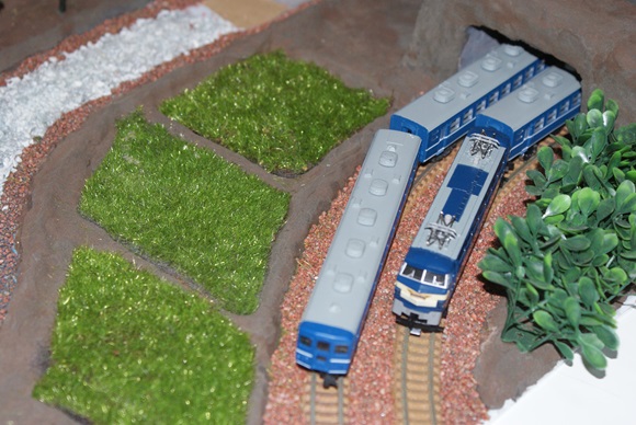 ・ 駐車場入場路下列車トンネルですれ違うブルートレイン