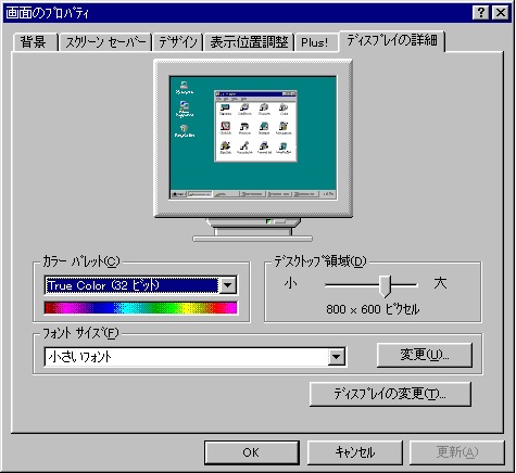 現在はカラーパレット『32 ビット』、デスクトップ領域『800 X 600』に設定しています