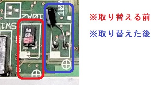 画像は取り外したコンデンサと新しく取り付けるコンデンサの画像です。