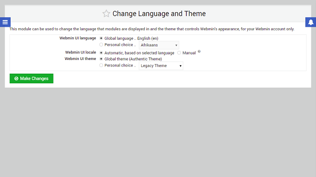 | 『Webmin UI language』の『Personal choice..』にチェックを入れ『日本語』を選択して『Make Changes』をクリック | |