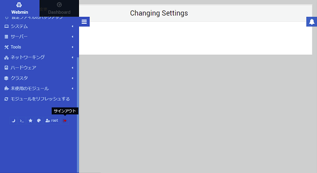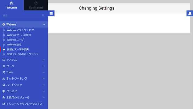 | 表示されたメニューの『Webmin』 → 『Change Language and Theme』をクリック | |